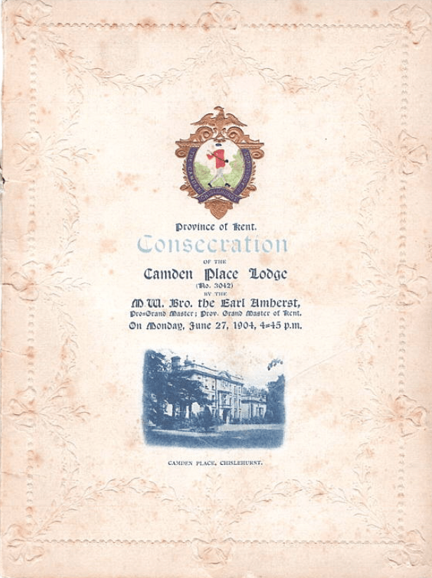 The Lodge was consecrated in 1904 at Camden Place, the home of Chislehurst Golf Club, by Lord Amherst. He was at the time, Pro Grand Master and Provincial Grand Master of Kent.